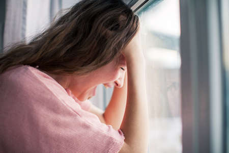 Upset crying woman with tears eyes suffering from emotional shock, loss, grief, life problems and break up relationship near window with raindrops. Female received bad news