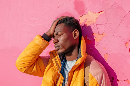 Young tired African American man holding head suffering from headache on early morning against pink kinfolk wall background