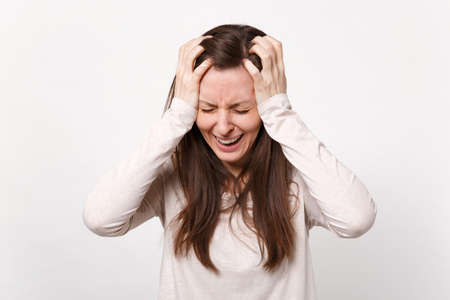 Frustrated crying dissatisfied young woman in light clothes keeping eyes closed, putting hands on head isolated on white wall background. People sincere emotions lifestyle concept. Mock up copy space