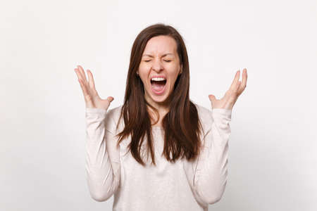 Portrait of crazy screaming young woman in light clothes keeping eyes closed spreading hands isolated on white wall background in studio. People sincere emotions lifestyle concept. Mock up copy space