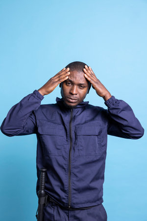 African american security agent is feeling ill and exhausted with a painful headache, dealing with burnout and tension from his duty. Unwell patrol guard with fatigue and sorrow.