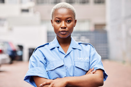 Portrait, black woman and security guard with arms crossed for surveillance service, safety and urban watch. Law enforcement, bodyguard or serious female police officer in blue shirt for city patrol