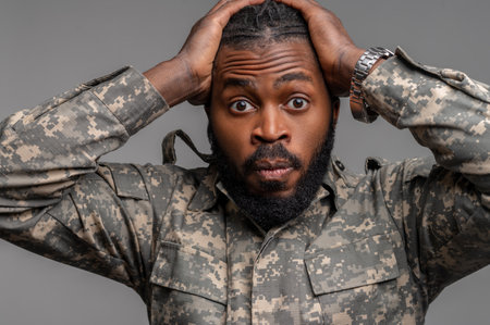 Furious military man in helmet screaming and grabbing his head isolated over black background