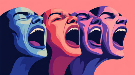 multiple superimposed faces expressing intense emotions in a dynamic flow of blue and red hues, creating a powerful and abstract visual effect
