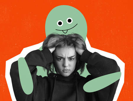 Teen, girl with personal problems standing with funny drawn cartoon little man, blot on bright background. Contemporary artwork