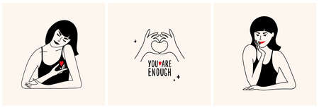 Set of vector illustrations with beautiful females, hands showing heart shape and lettering You are enough. Self care, love, body positive, acceptance. Young woman hugging herself. Smiling cute lady.