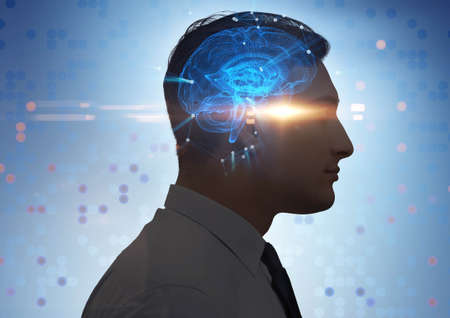 Brain representing artificial intelligence and businessman holding futuristic tablet. Data mining and another modern computer technologies concepts.