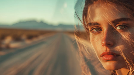 A young woman stands by a long, empty road in the desert, gazing thoughtfully into the distance. The soft light of sunset creates a warm glow on her face, enhancing her features.