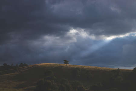 Single Tree on the field, sunshine coming on the tree, storm