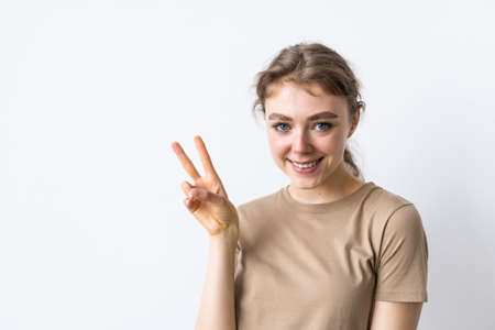 Young happy smiling woman showing victory sign.