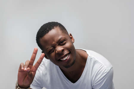 Smiling young african american man winking at the camera. Joy, happiness, laugh, good luck, great mood. Grey background with free space.