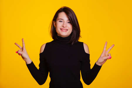 Woman makes peace or victory sign with both hands, dressed in black turtleneck, feels cool has a toothy smile, isolated over yellow background with space for text. people and body language.