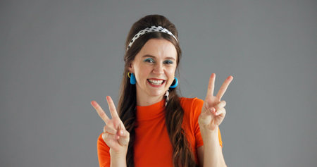 Portrait, smile and woman with peace sign in studio for retro fashion on gray background space. Happy, hand gesture and person with v symbol for emoji, girl and old school style with signal.