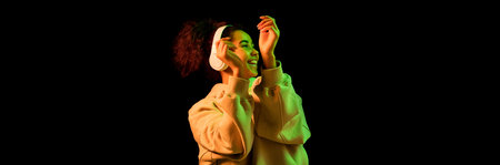Flyer. African-american womans portrait on dark background in orange-green neon light. Listening to music with headphones. Concept of human emotions, facial expression, sales, ad, fashion. Copyspace.