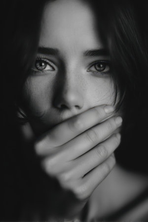 A close up woman hand mouth black and white emotional serious portrait soft light