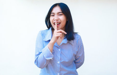 Young cute Asian woman with finger on lips and looking away