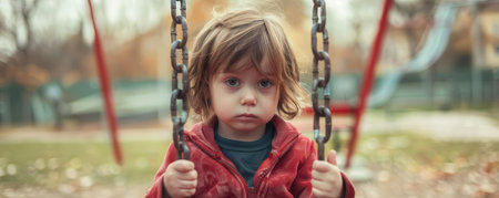 A pensive child sitting on a swing in a playground, surrounded by autumn leaves and a calm atmosphere.