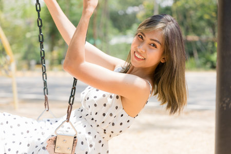 Outdoors lifestyle fashion portrait stunning young Asian women enjoying on the swing in the park and Natural background. She wearing stylish