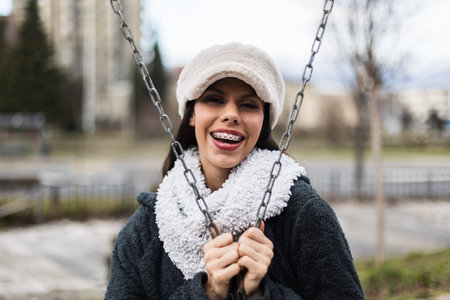 Young woman on swing outdoors, smiling warmly with winter attire and braces