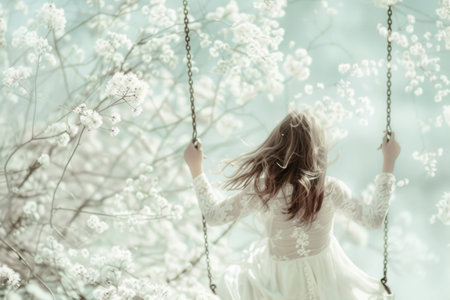 A serene young woman with long, flowing hair gently sways on a rustic swing, surrounded by blooming flowers in a sun-drenched meadow. Her ethereal white dress billows softly in the breeze, capturing the essence of tranquility and youthful innocence.