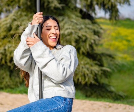 Outdoor swing scene with a playful woman in casual sweater and jeans, enjoying nature in a forest setting, capturing carefree movement and rustic charm for lifestyle stock photography