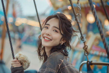 Joyful Young Woman Enjoying a Funfair Ride on a Carousel, Smiling with Lights Twinkling at Dusk AI Generative