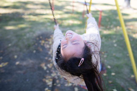 Happy child girl on swing. Little kid playing in the autumn pack.