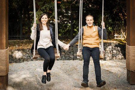 Romantic couple is having fun outside. Enjoying spending time together on a swings.