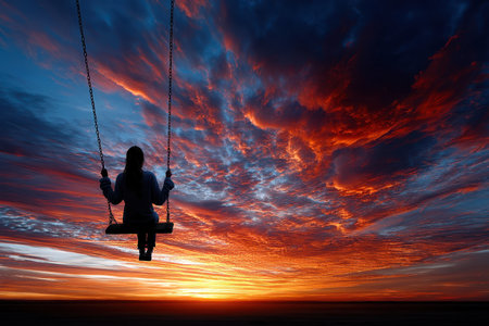 Silhouetted figure on a swing against a dramatic and vibrant sunset sky