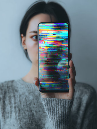 A person holds a distorted smartphone showing glitchy visuals, symbolizing a nervous breakdown and the impact of technology on mental health.