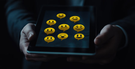smiley faces with glowing stars above a tablet, digital rating concept. High quality photo