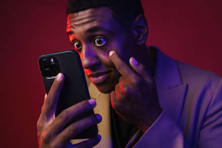 Young black man dressed in jacket looking at cellphone isolated over red wall