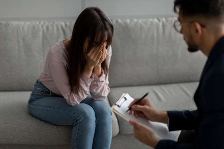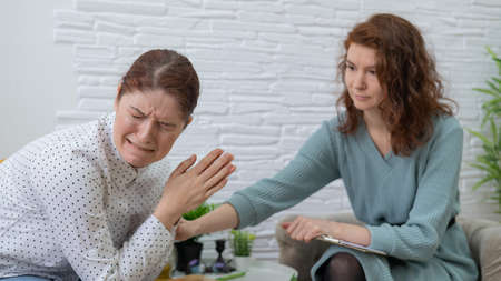 Caucasian woman cries and holds hands on her face at the session of a psychotherapist. A gray-haired male psychologist is talking to a female patient. Treatment of chronic depression and panic attacks