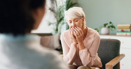 Psychology, stress and old woman with psychologist in consultation for help, mind and mental health evaluation. Trauma, memory or patient remember ptsd trauma with therapist for depression or anxiety