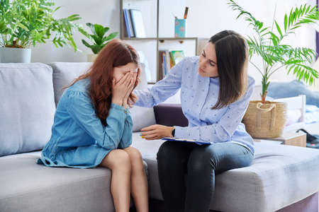 Photo of depressed caucasian woman crying and having conversation with psychologist on therapy session in room