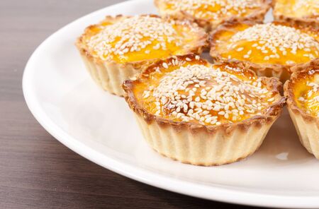 Close up view - delicious fresh shortcrust tart cake with yellow cream for sale on counter of shop, grocery, market, cafe or bakery. Dessert, sweet food and confectionery concept