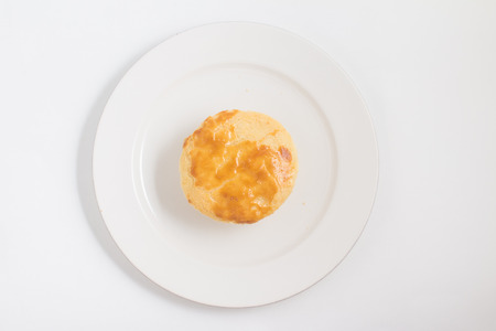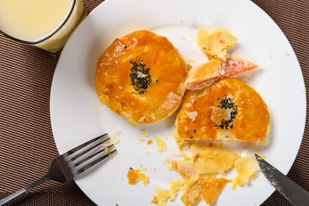 Fresh Baked Cantonese BBQ Pork Pies topping with white sesame served in white plate on marble top table.