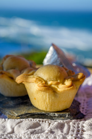 Portuguese food, oven baked chicken pie empada de frango, served outdoor with view on blue sunny Atlantic ocean near Sintra in Lisbon area, Portugal