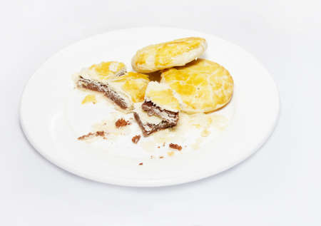 baked pie stuffed with chicken, shrimp, meat on the table, isolated on blurred background. typical Brazilian food empadinha