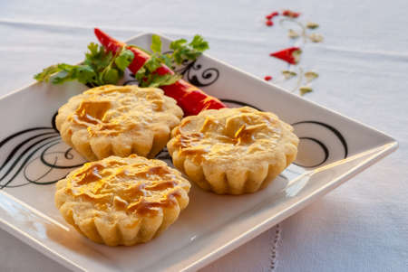 Empada Brazilian snack. Small pie with filling on brown ceramic plate and white cloth