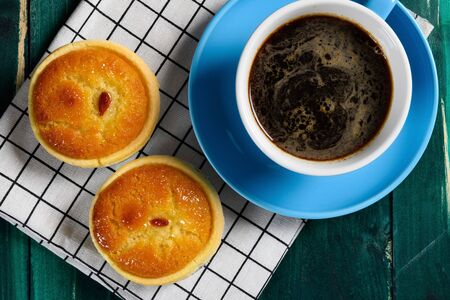 portuguese pastry pastel de nata on wooden table with hot coffee berverage