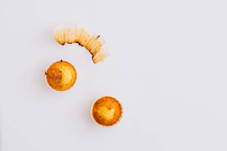 Queijadas or Queijadinhas, little Portuguese cheesecakes made with Queijo Fresco close-up in a baking dish on the table. Horizontal top view from above
