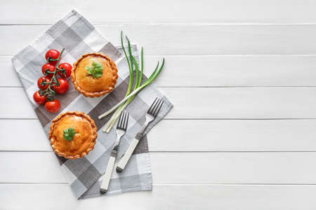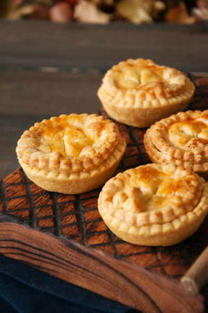 Delicious Australian mini meat pie on wooden board top view rustic style