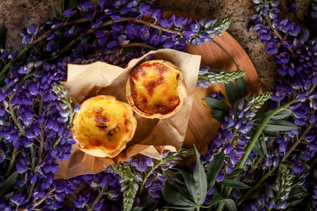 Traditional portuguese cakes surrounded by lupins. Yellow and purple. Pastel de Nata