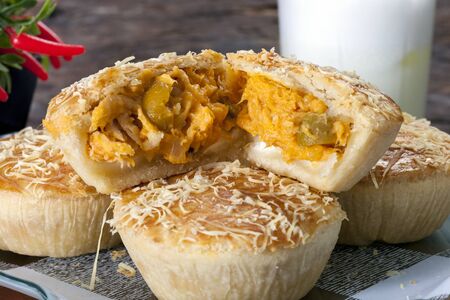 typical brazilian food baked empada stuffed with chicken meat and sauce isolated on the table