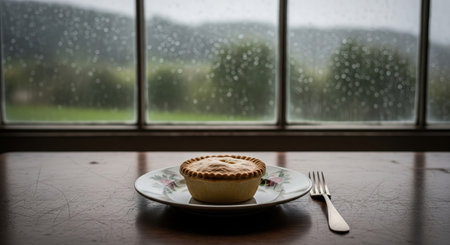 A single New Zealand meat pie on a plate, providing a warm and comforting meal on a cozy, relaxing rainy day by the window.