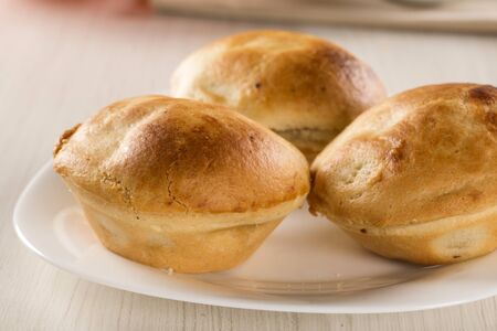 Empada Brazilian snack. pie with chicken on white plate on wooden background.