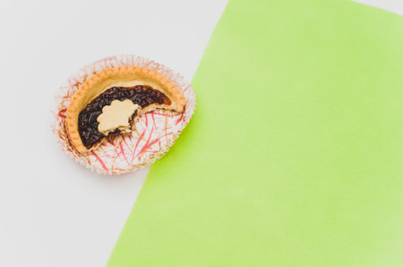 isolated cherry jam tart in a paper backing cup on a green white background with text space