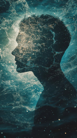 A man's profile is beautifully illustrated with swirling cosmic elements, creating a mystical effect. The backdrop features calming shades of blue, enhancing the ethereal feel.