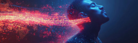 A man's profile is filled with mystical colors and energy, creating a captivating connection to the universe. The surreal atmosphere enhances the enchanting vibe of the scene.